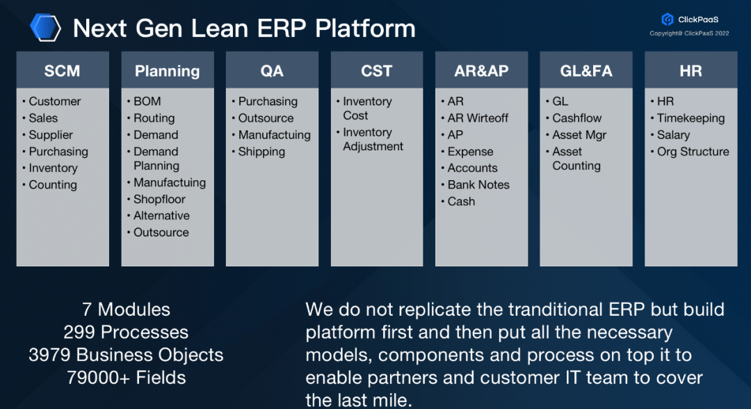 开云在线平台把这样的逻辑同样应用到了工业领域。比如在纷繁复杂的泛ERP场景中,开云在线平台把ERP场景中的核心模型内置在元数据模型平台上,并不是复制一个传统ERP,而是把核心的模型、组件、流程开放性的构建完善,支持开云在线平台的伙伴和客户通过一个瘦身的Lean ERP Platform进行扩展开发的逻辑构建最后一公里的业务实现。